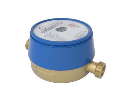 Contador de água fria de leitura directa, de jacto simples, caudal nominal 1,5 m³/h, diâmetro 1/2", temperatura máxima 30°C, pressão máxima 16 bar, apto para águas muito duras, com tampa, racores de ligação e precinto.