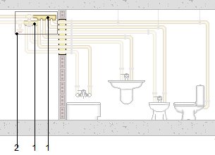 Colector de plástico (PPSU), em H, com entrada de 20 mm de diâmetro e três derivações, uma de 20 mm e duas de 16 mm de diâmetro.