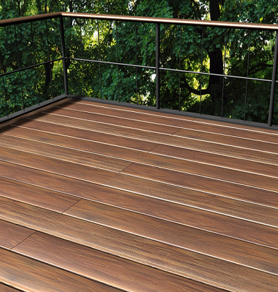 Réguas maciças de compósito (WPC) com fibras de madeira e polietileno, de 20x127x2440 mm, uma face à vista com textura de madeira e ranhuras laterais, segundo NP EN 15534-4. |