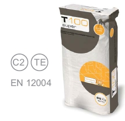 Cimento cola melhorado, C2 TE, com deslizamento reduzido e tempo de colocação ampliado T100 Super, segundo NP EN 12004, "TAU CERÁMICA", para a colocação em camada fina do pavimentos e revestimentos de material cerâmico em interiores e exteriores, composto por cimentos de alta resistência, inertes seleccionados e alto conteúdo de resinas sintéticas. |