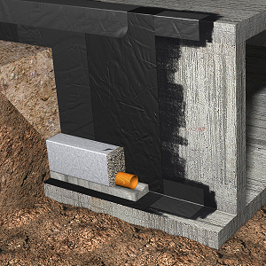 Vala drenante em perímetro de muro em contacto com o terreno, de 45 cm de altura e 70 cm de largura, com uma pendente mínima de 0,50%, para captação das águas que se filtram através da superfície do terreno, colocando-se no fundo um tubo ranhurado de PVC de parede dupla, a exterior corrugada e a interior lisa, cor telha RAL 8023, com ranhurado ao longo de um arco de 220° no vale do corrugado, para drenagem, rigidez anelar nominal 4 kN/m², de 200 mm de diâmetro nominal, 182,4 mm de diâmetro interior, segundo NP EN 13476-1, comprimento nominal 6 m, união por copa com junta elástica de EPDM, colocado sobre base de betão simples C20/25 (X0(P); D25; S2; Cl 1,0), de 10 cm de espessura, em forma de meia cana para colocar o tubo e formar as pendentes, com enchimento de 25 cm a cada lado do tubo e enchimento superior de 25 cm por cima da geratriz superior do tubo com brita filtrante não seleccionada, tudo envolto num geotêxtil não tecido composto por fibras de poliéster entrelaçadas, com uma resistência à tracção longitudinal de 1,63 kN/m, uma resistência à tracção transversal de 2,08 kN/m, uma abertura de cone ao ensaio de perfuração dinâmica segundo NP EN ISO 13433 inferior a 27 mm, resistência CBR ao punçoamento 0,4 kN e uma massa superficial de 200 g/m². Inclusive lubrificante para montagem.
