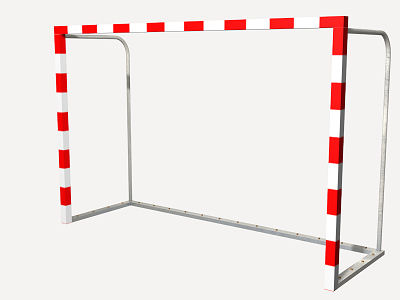 Baliza amovível de andebol ou futsal de 3 m de base e 2 m de altura formada por: postes e barra de secção quadrada de 80x80 mm, de madeira, acabamento com verniz de poliuretano, em faixas brancas e vermelhas, base de tubo de secção rectangular de 80x40 mm e rede de nylon com cordas de 3,5 mm de diâmetro com suportes de poliamida para fixação da rede à baliza, colocação com bucha química, anilha e parafuso.
