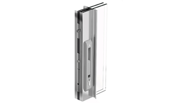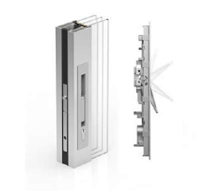 Sistema de bloqueio com fechadura interior e exterior, para porta de correr com folhas de grandes dimensões.